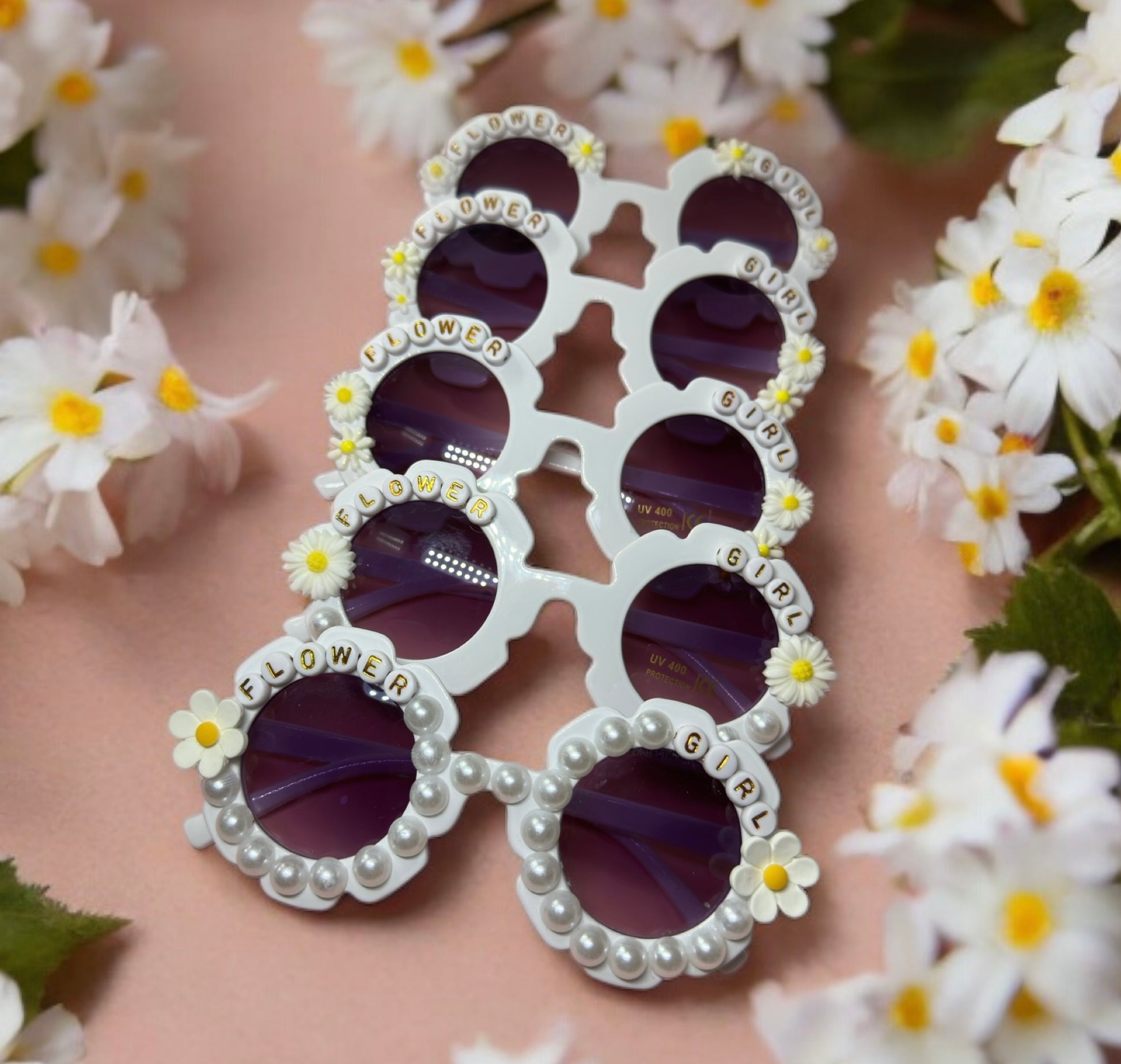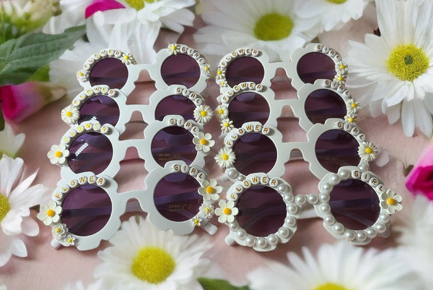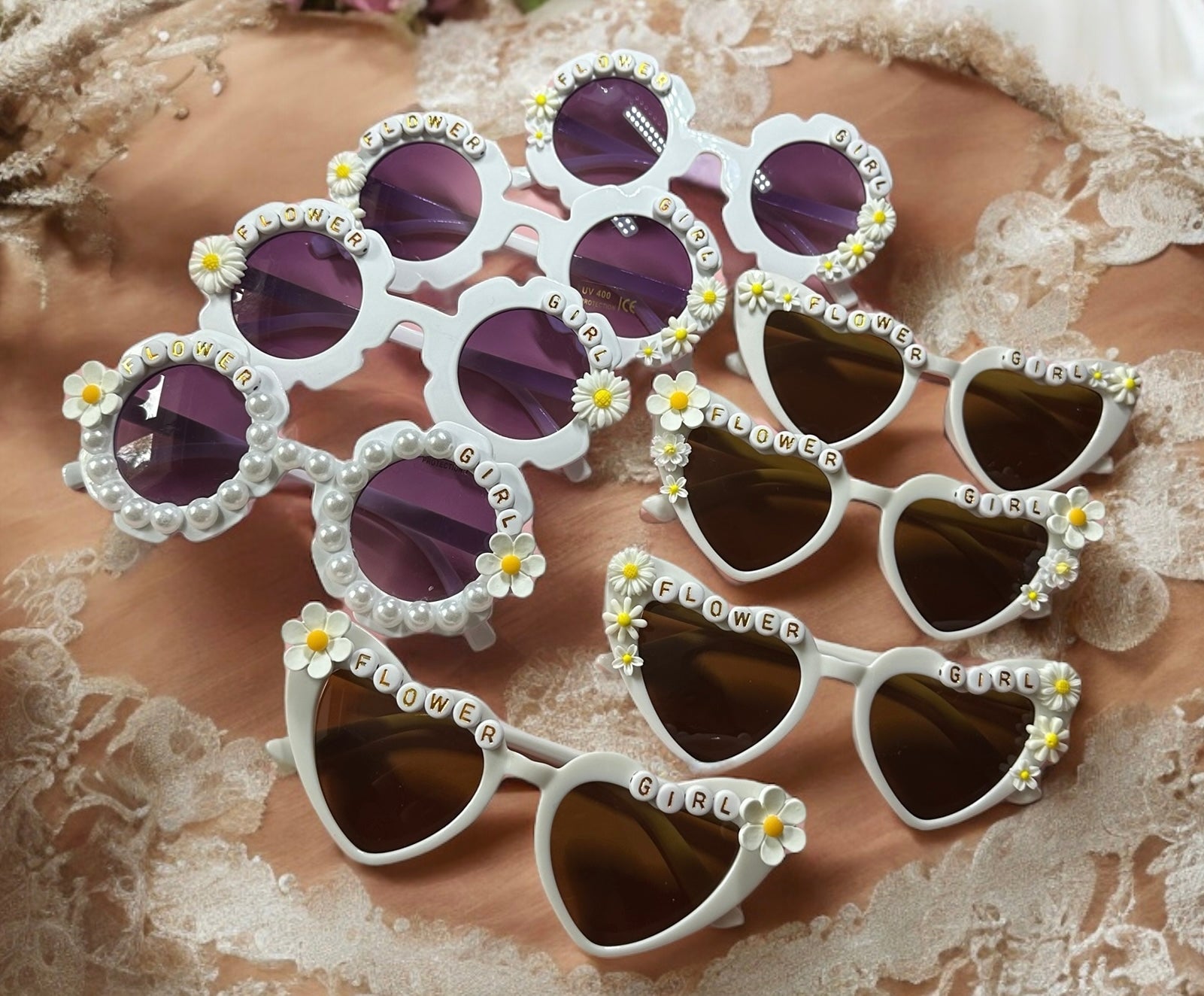 Children’s flower girl sunglasses Toddler-child size - one size fits all . Available in a variety of colours and styles.Personalised children’s sunglasses/ personalised toddler sunglasses / party favour / kids sunglasses / stocking filler / beaded sunglasses / flower sunglasses / flower girl . Please note colours may vary due to photos and lighting. please note when you select a plain pair of glasses these will NOT come with anything on them , no flowers and no personalisation . PLEASE NOTE DELIVERIES OUTSIDE OF THE UK CAN TAKE 3-4 WEEKS NOT THE ESTIMATED TIMES SET BY ETSY.